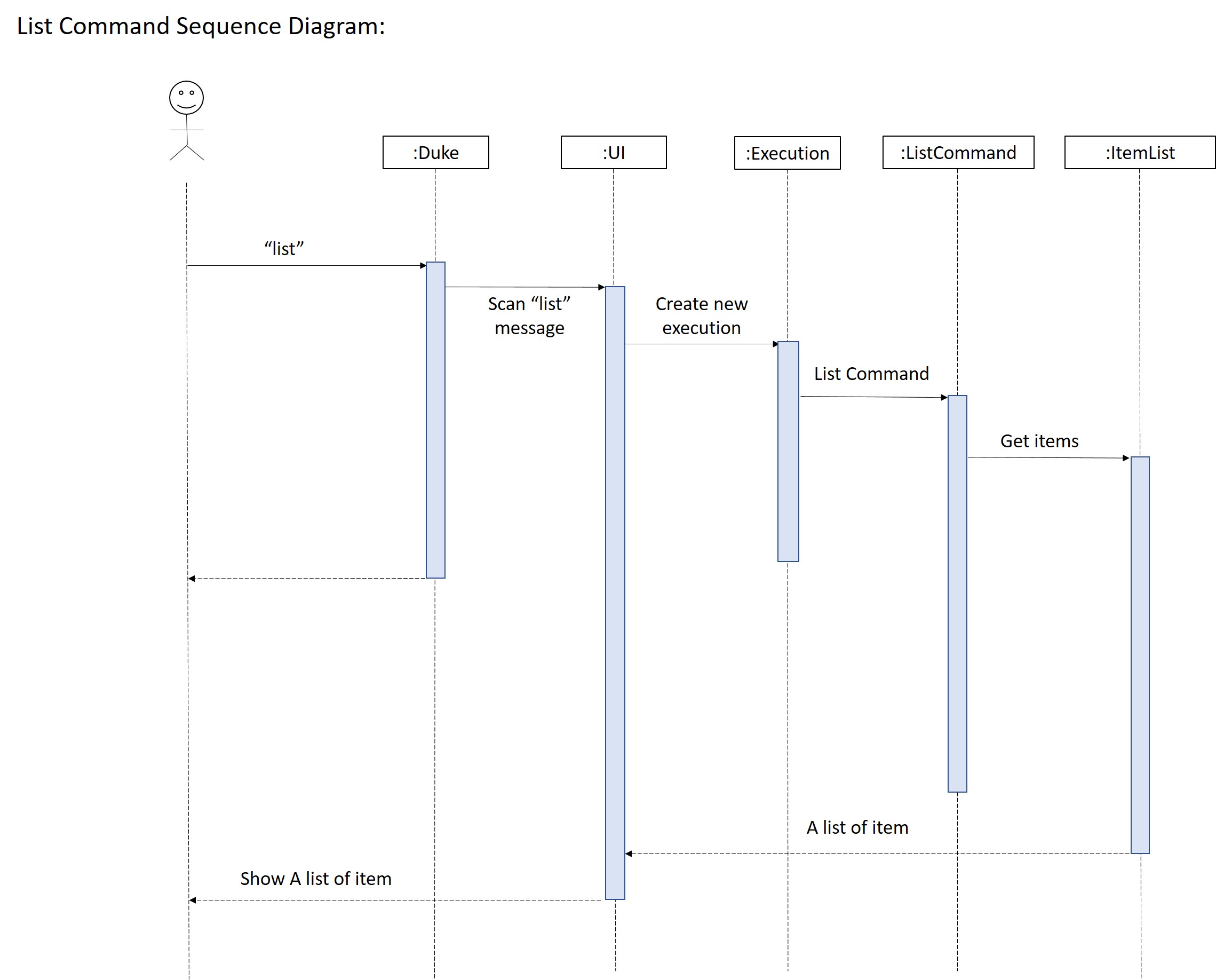 UI scannedlistcommand from user,Executioncreate a newListCommandandrun()to get the items from Arraylist, itemList return the items to UI and show to user.
